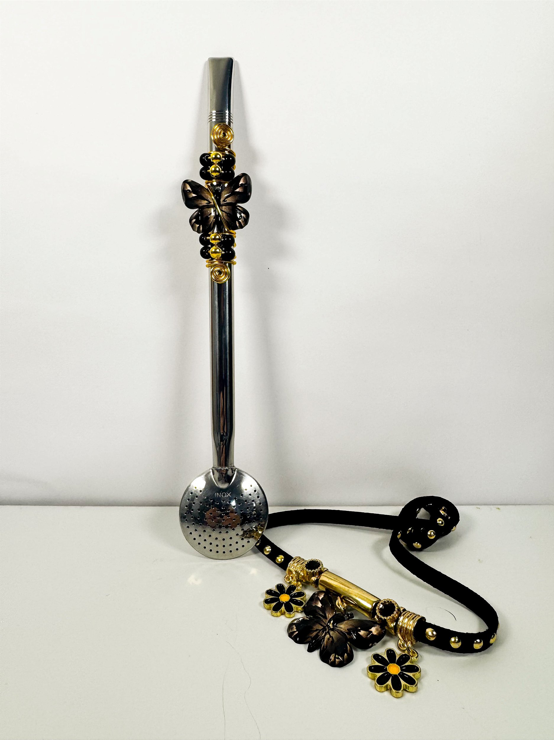 Adicione estilo e personalidade ao seu ritual com nosso kit bomba + choker combinando! A bomba de chimarrão em aço inoxidável de 21 cm, resistente e durável, traz um design exclusivo com miçangas decorativas e borboleta preta detalhada, perfeita para quem busca sofisticação até na hora do mate. Acompanha um choker artesanal combinando, com a mesma borboleta preta, ideal para complementar seu look com atitude.