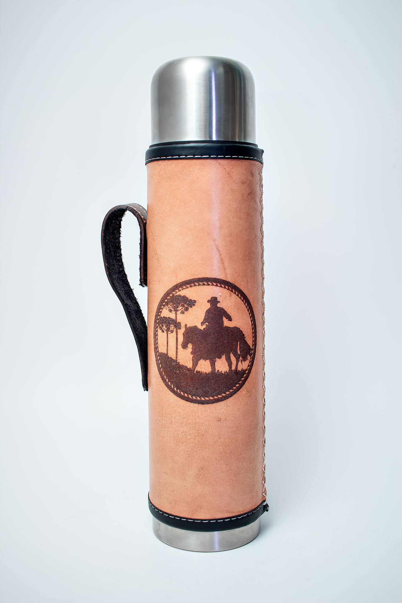 Garrafa térmica em açon inox, com revestimento em couro artesanalmente. Possui capacidade de 1 litro.