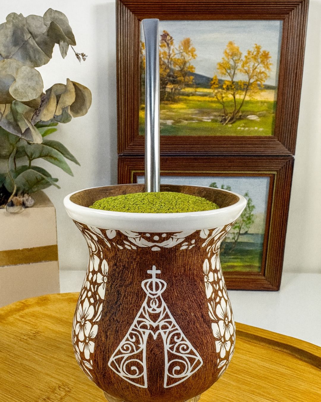 A cuia de madeira modelo bago, em tom branco, é gravada em 360° com flores delicadas, envolvendo toda a peça em um design encantador. No centro, a imagem de Nossa Senhora Aparecida torna a cuia ainda mais especial, transmitindo espiritualidade e proteção a cada mate.