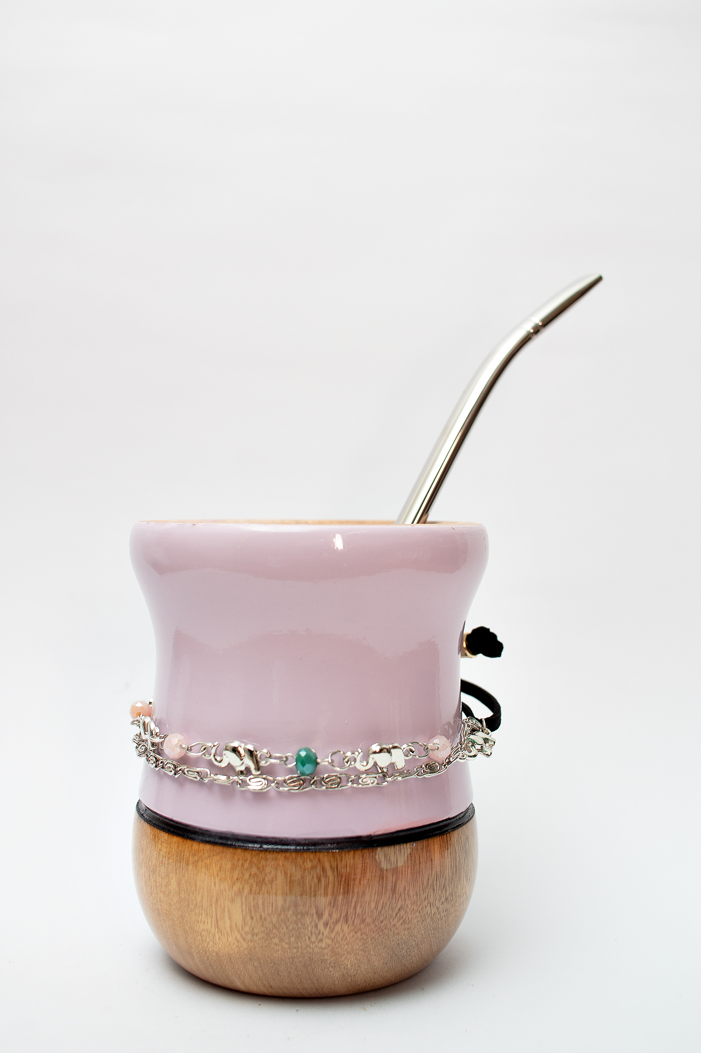 Cuia de madeira no formato bago na cor lilás em tom pastel, proporcionando um chimarrão na medida certa! Acompanha Choker delicada com elefantinhos com pedras coloridas e bomba em inox.