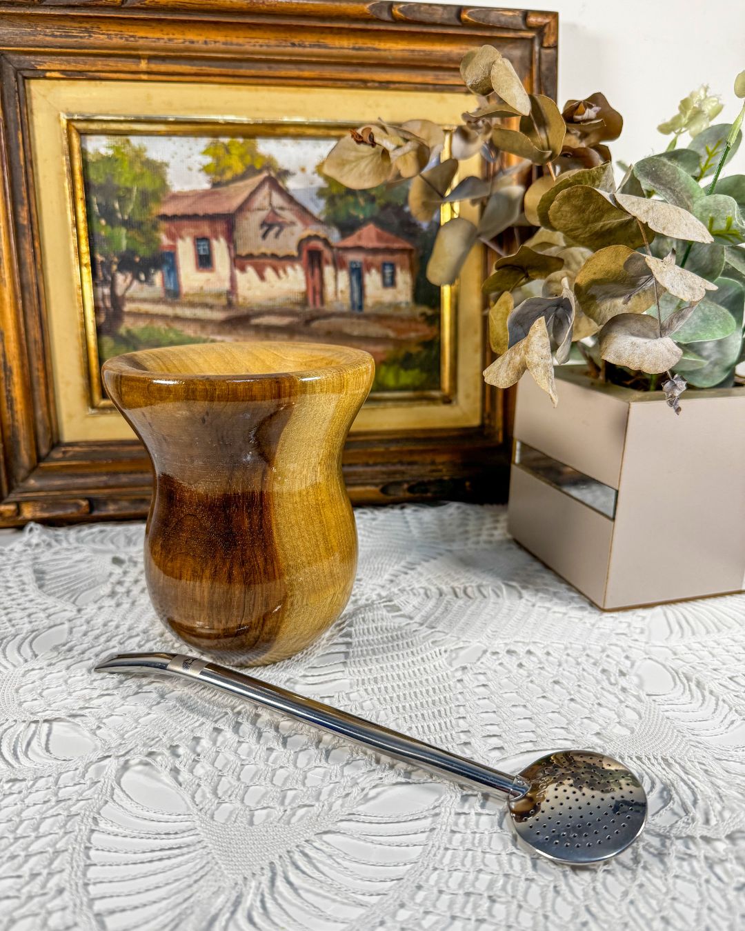A cuia de madeira modelo bago, em tom natural, preserva os traços originais da madeira, trazendo rusticidade e sofisticação ao mesmo tempo. Seu design evidencia o aspecto artesanal e único de cada peça, tornando cada cuia exclusiva.