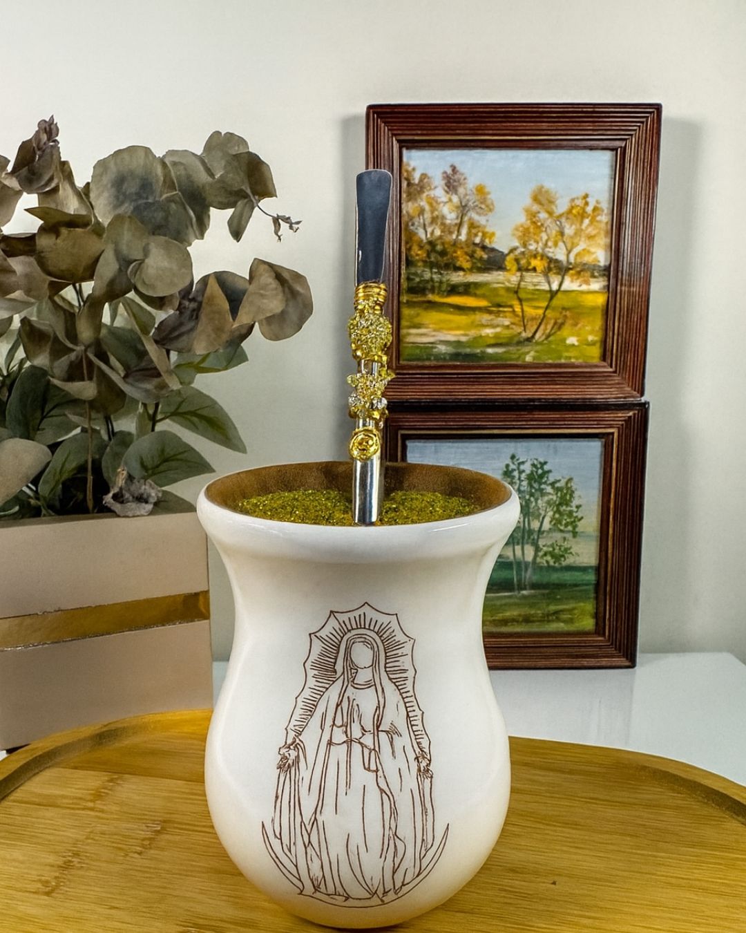 Esse kit é uma verdadeira expressão de fé e beleza: a cuia branca com Nossa Senhora de Guadalupe e a bomba com flor brilhante transformam o momento do chimarrão em um ritual de paz e devoção.