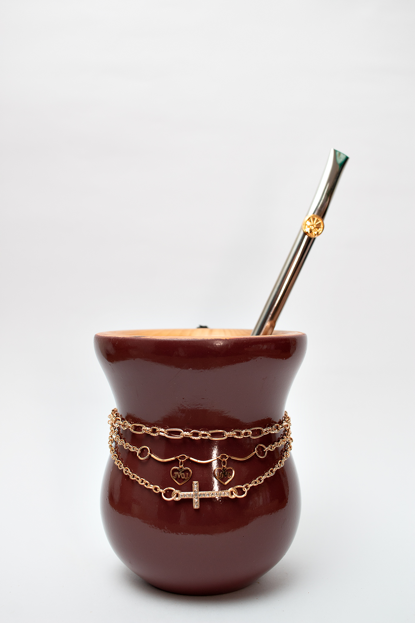 Cuia de madeira no modelo bago na cor vermelho mais fechado, proporcionando um chimarrão no tamanho ideal, nem longo e nem curto! Vem com uma Choker super delicada, com detalhes em correntaria. Acompanha bomba em inox no tamanho ideal para a cuia.