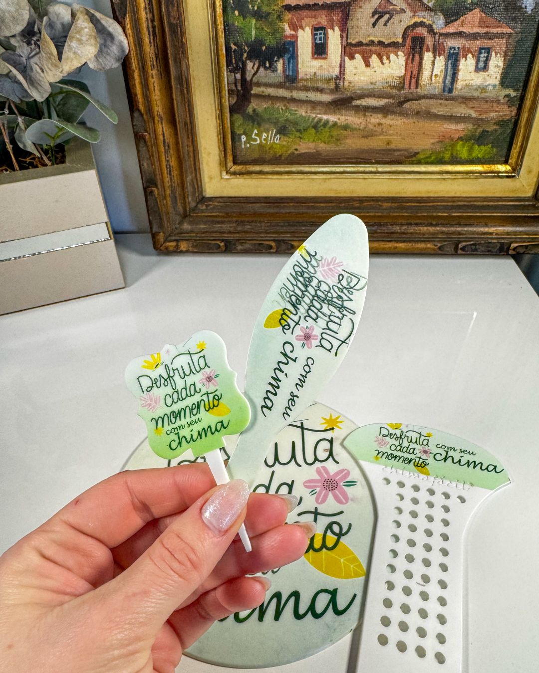Placa decorativa com a frase “Desfrute cada momento com seu chima”