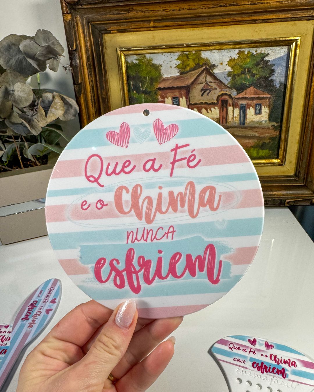 Placa decorativa com a frase “Que a fé e o chima nunca esfriem”